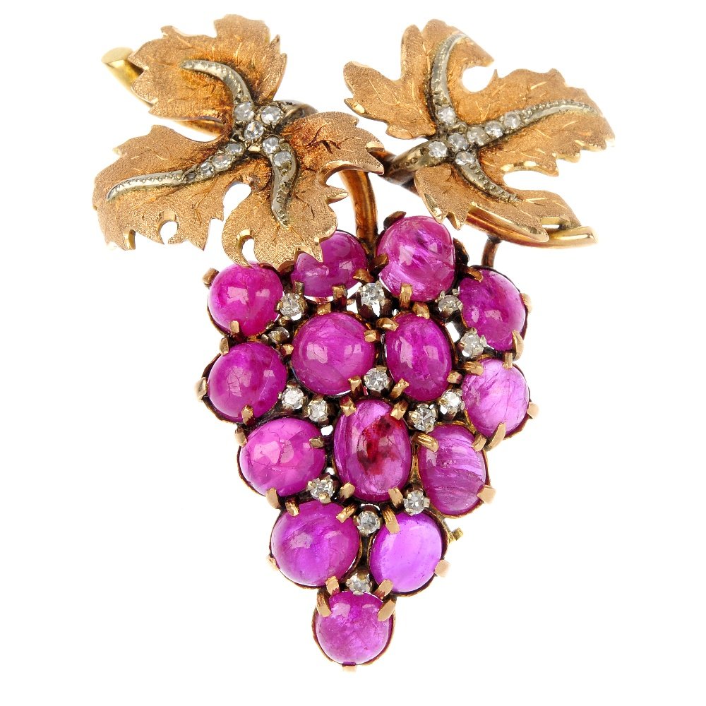 A ruby and diamond grape brooch.