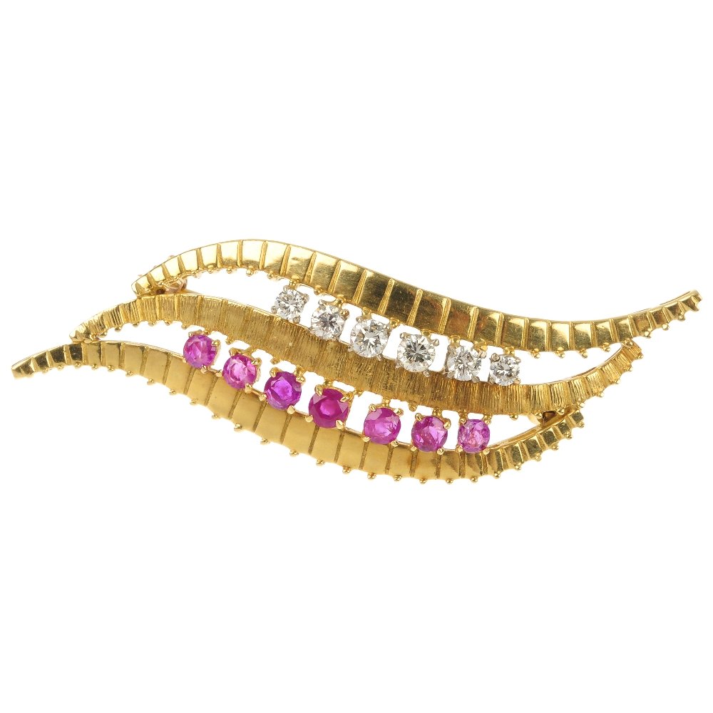 A ruby and diamond leaf brooch.