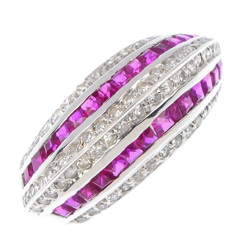 SoldRUBY & DIAMOND MODERN 14KT RING (SZ 4.5)Lady's 14kt gold ruby & diamond ring. The ring features multiple rows containing thirty eight (38), channel set, square faceted rubies accented with ten (10), prong set, round brilliant cut diamonds.See Sold Price
