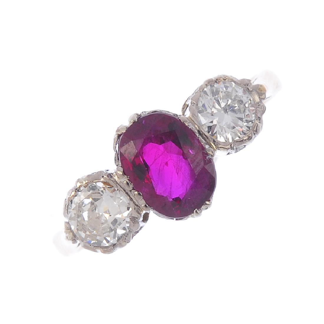 A ruby and diamond three-stone ring. The oval-shape
