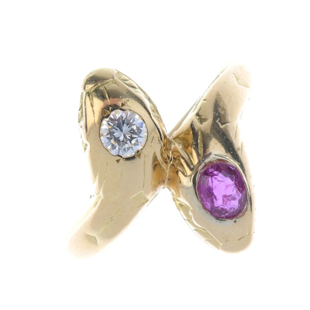 SoldRUBY AND DIAMOND DOUBLE SNAKE RINGRUBY AND DIAMOND DOUBLE SNAKE RING, designed as twisted snakes, set with a diamond of approx. 0.18 ct. and a ruby of approx. 0.23 ct. to the head. Size O 1/2. 9.2 grams.See Sold Price