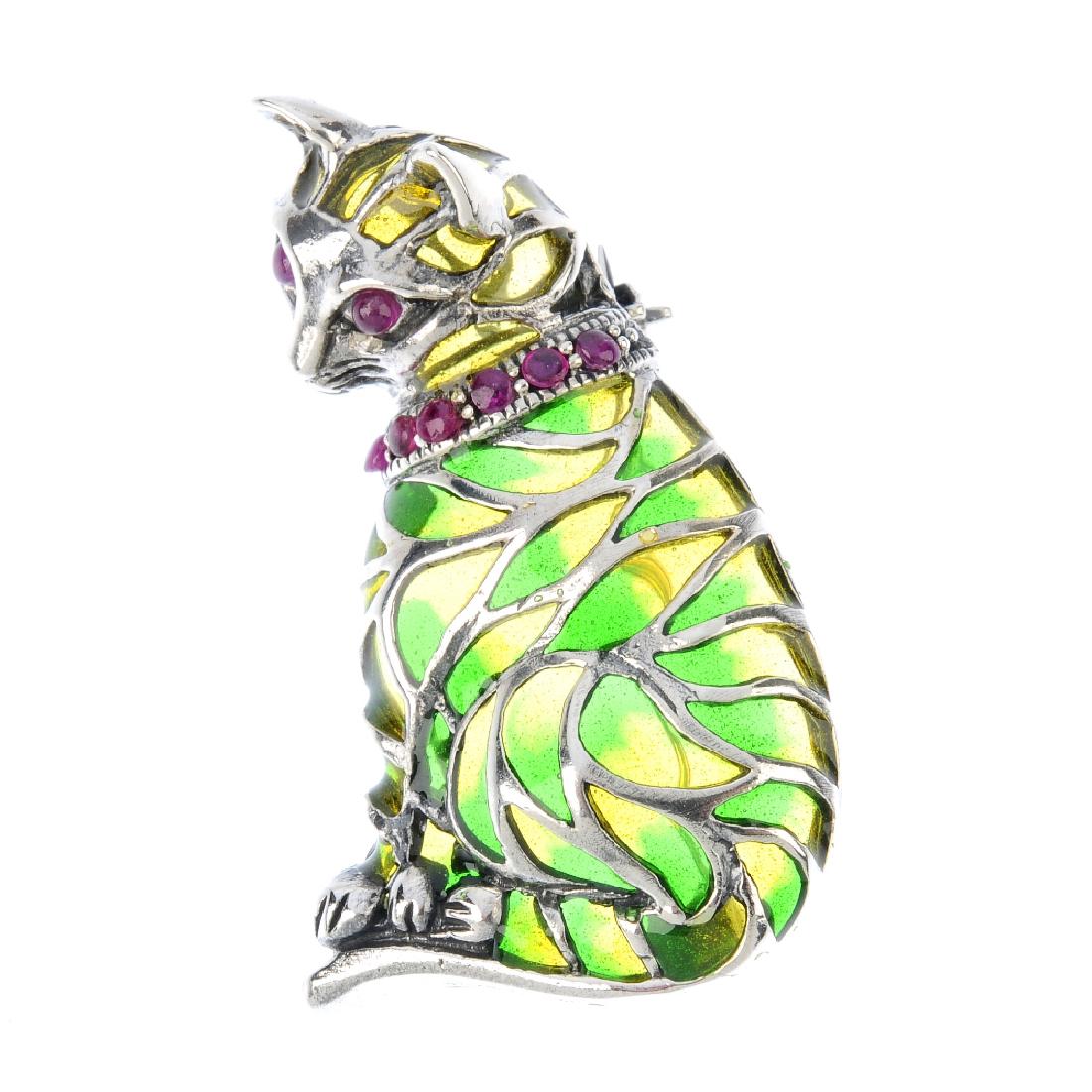 A ruby and plique-a-jour enamel cat brooch. The