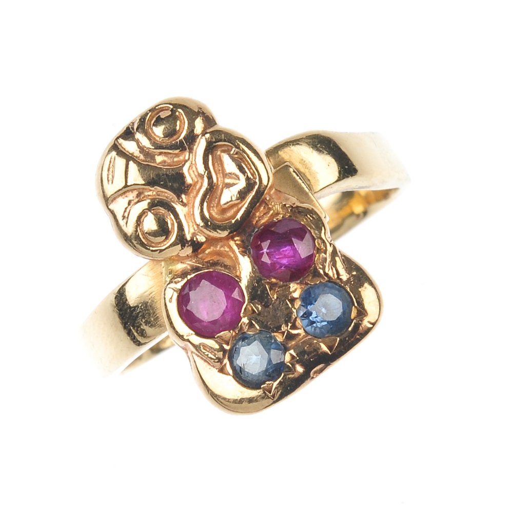 A ruby and sapphire abstract ring.