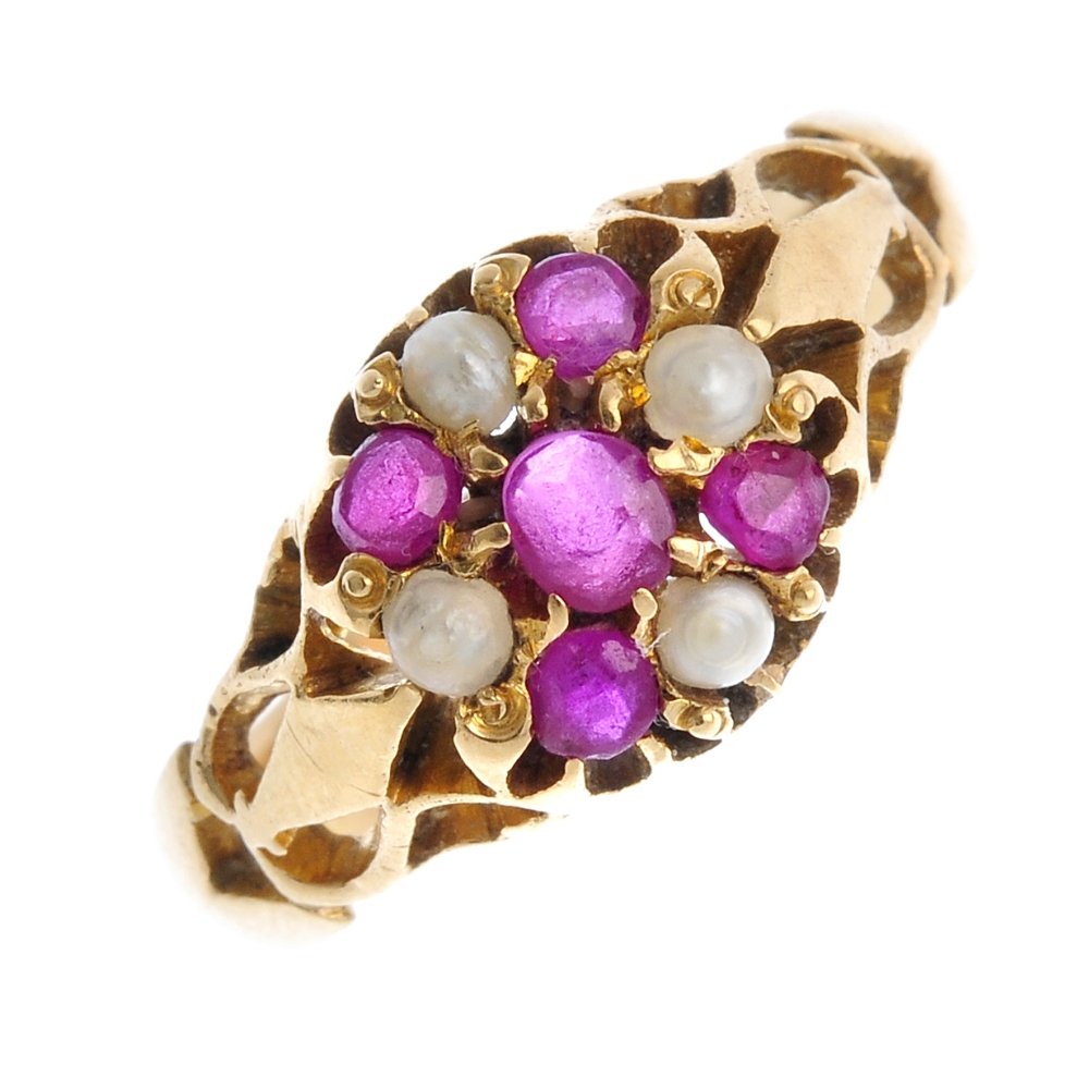 A ruby and seed pearl ring. The oval-shape ruby, within
