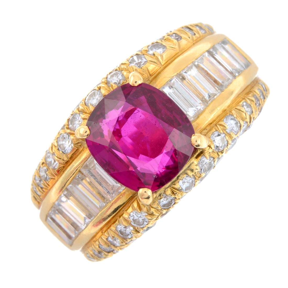 A ruby, baguette and brilliant-cut diamond ring. Ruby calculated weight 2.18cts,