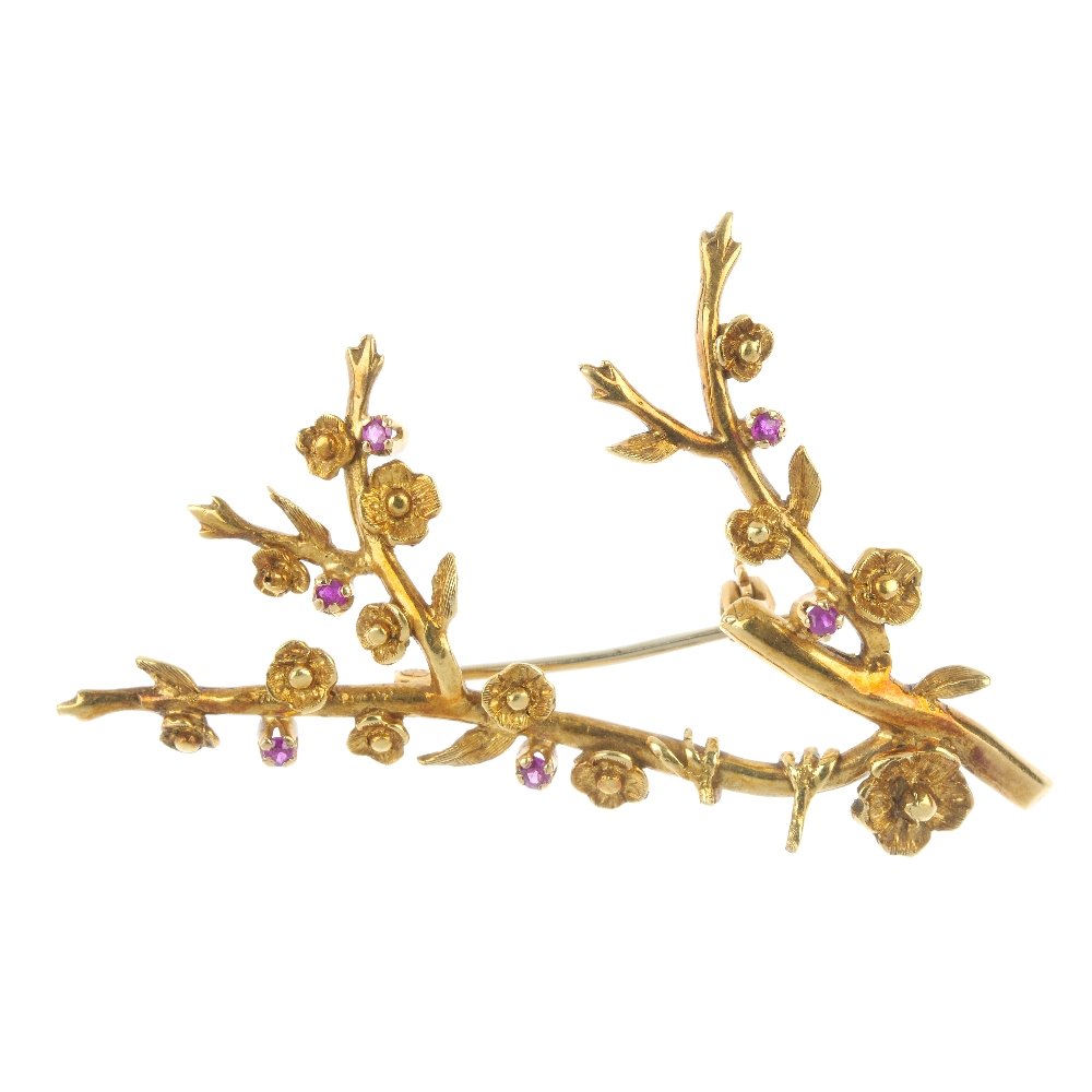 A ruby cherry blossom brooch.