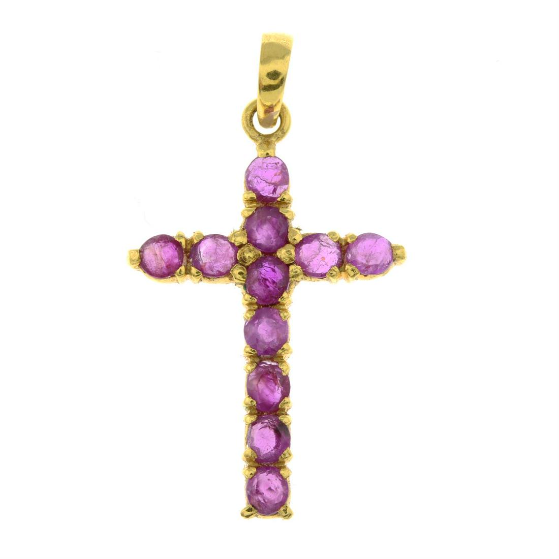 SoldGOLD & RUBY CROSS PENDANTset with 3 (5mm) ruby cabochons, in carved yellow gold, bale stamped 14K Italy, cross tests 14K, length 1.1in. excluding bale, 3.5gms.See Sold Price