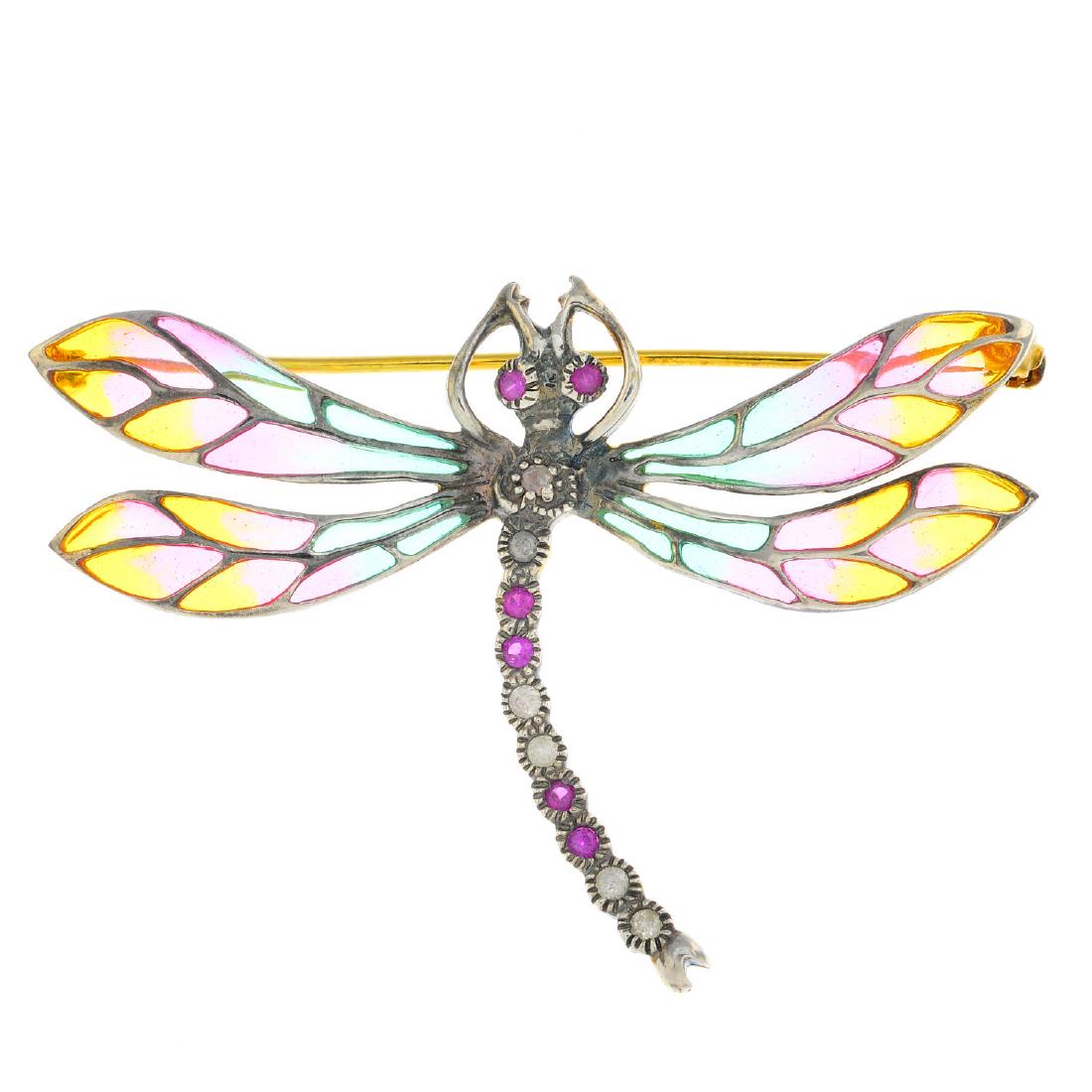 A ruby, diamond and plique-a-jour enamel dragonfly