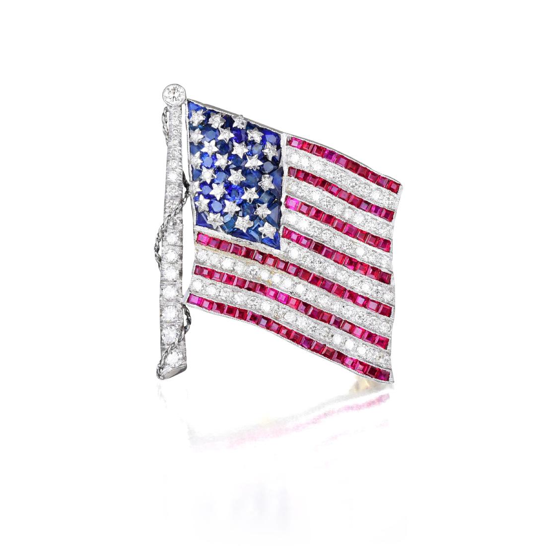 Circa 1960s American Flag Heart Shape Pendant Brooch with Diamonds, Rubies & Sapphires crafted in 14A beautiful American Flag design heart shaped pendant / lapel pin brooch. This is made in the 1960s. It has a beautiful American flag designed out of diamonds, rubies and sapphires and crafted in 14 k