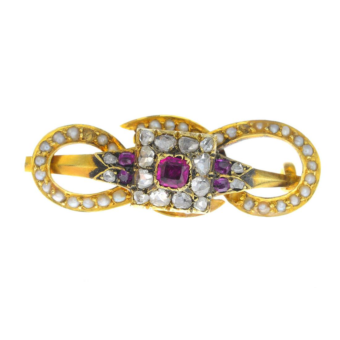 A ruby, diamond and split pearl brooch. Length 3cms.