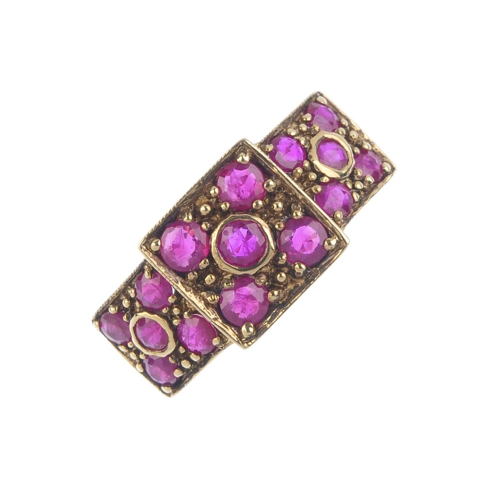 A ruby dress ring. Designed as a series of three ruby