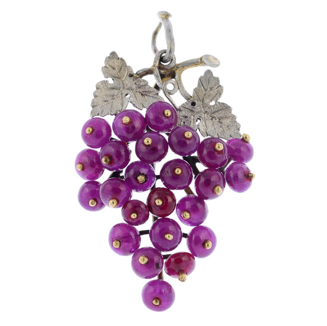 A ruby grape brooch. Designed as a bunch of ruby bead