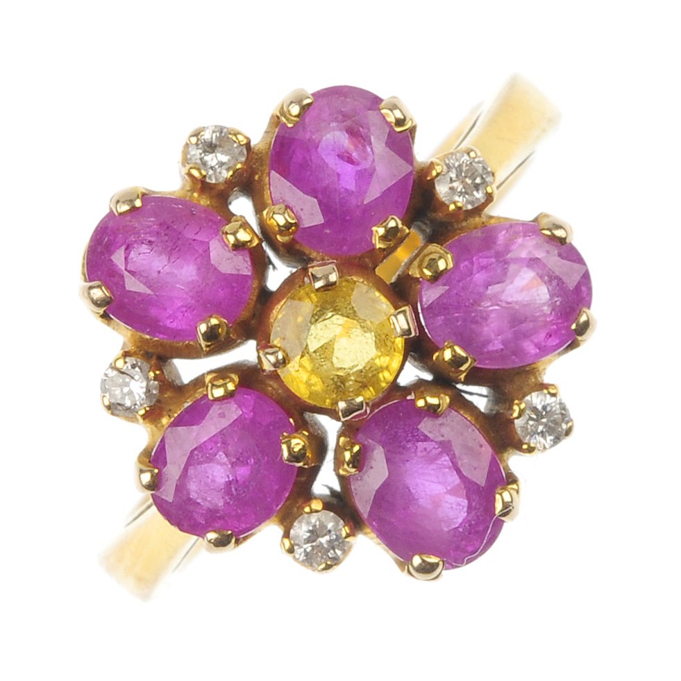 A ruby, sapphire and diamond cluster ring.