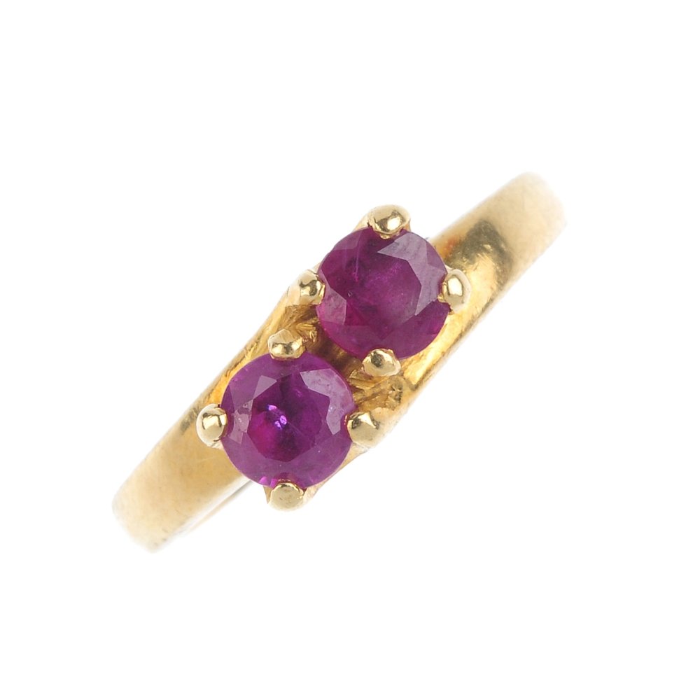 A ruby two-stone ring. The twin circular-shape rubies,