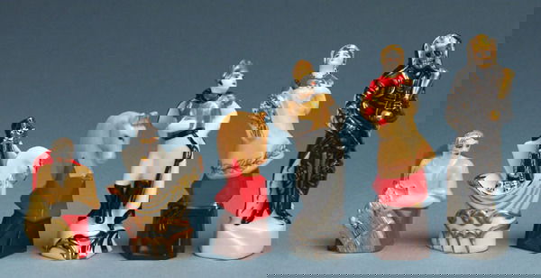 SoldRussian/Soviet Porcelain Chess Set Circa 1970sRussian/Soviet Union Porcelain Chess Set, circa 1970s. A more joyous depiction of Kings, Queens and Bishops with accompanying dogs. Heights range from 2.75" (7 cm) to 3.5" (9 cm).See Sold Price