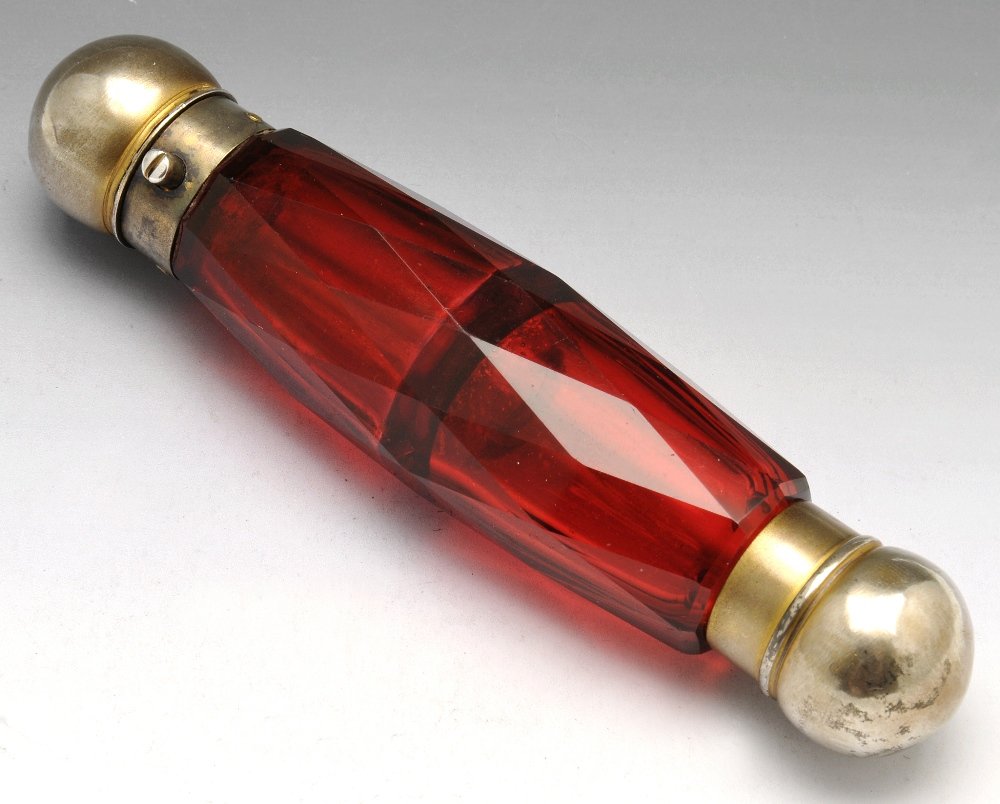 A Sampson Mordan ruby glass double-ended scent bottle.