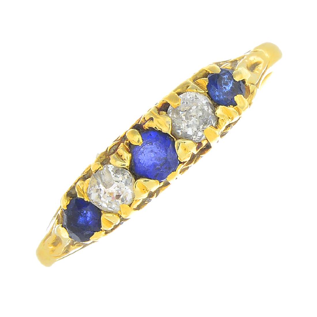 A sapphire and diamond five-stone ring. The alternating