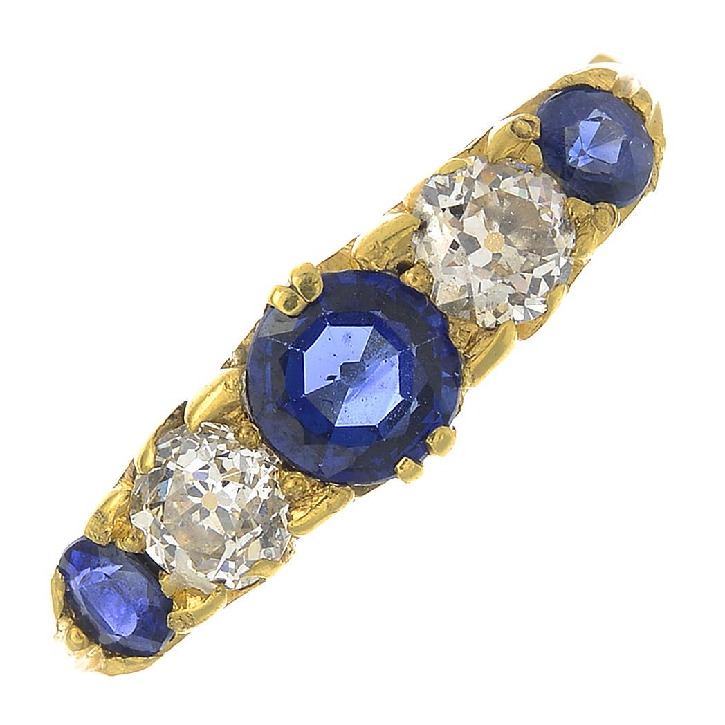 A sapphire and diamond five-stone ring.Total sapphire