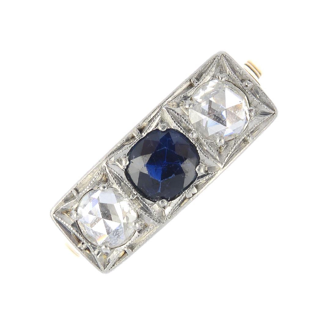 A sapphire and diamond three stone ring. The