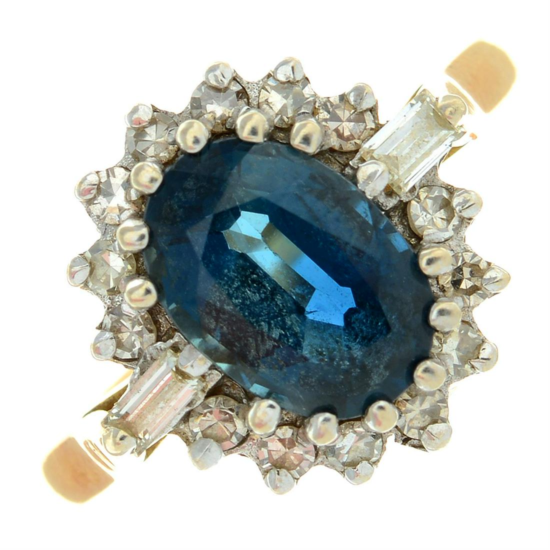 SoldA 1970s 18ct gold sapphire and single-cut diamondA 1970s 18ct gold sapphire and single-cut diamond cluster ring. Sapphire calculated weight 0.95ct, based on estimated dimensions of 7.2 by 5.2 by 3mms.Estimated total diamond weight 0.35ct.Hallmarks fSee Sold Price