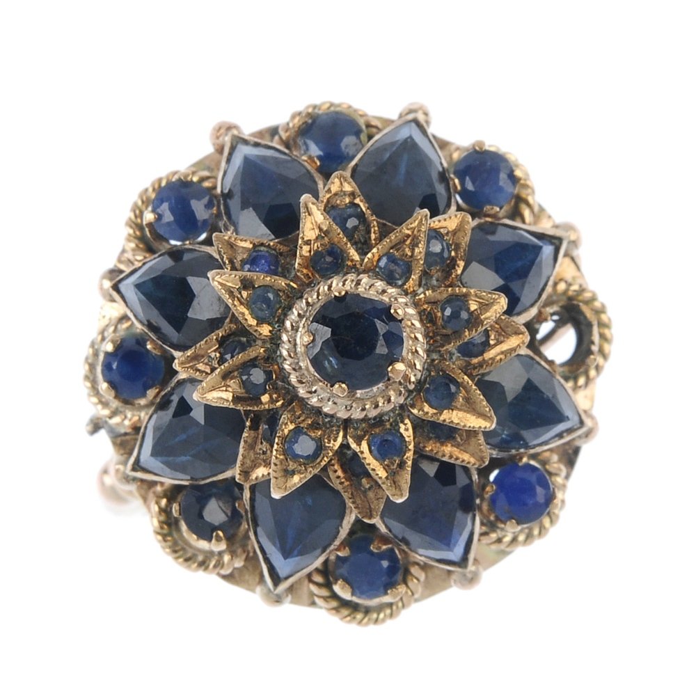 A sapphire cluster ring. The circular-shape sapphire