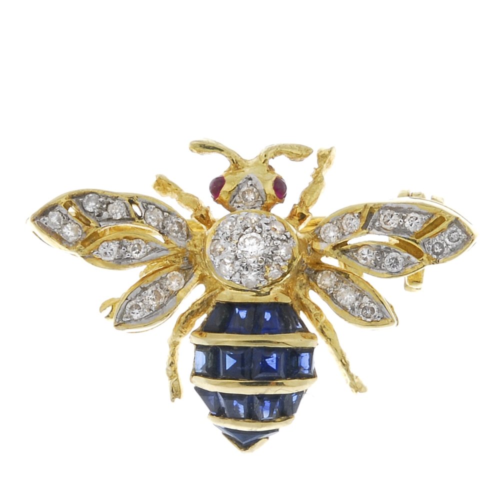 A sapphire, diamond and ruby bee brooch.