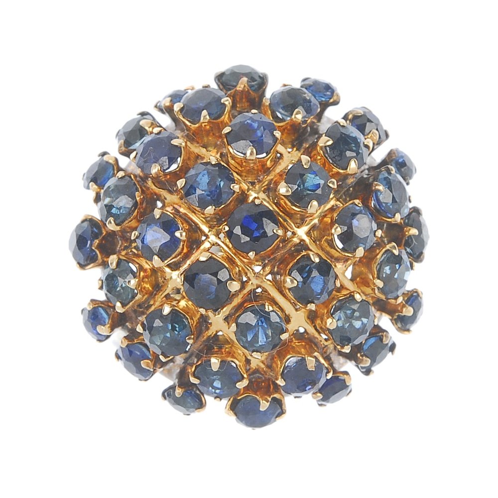 SoldAn 18ct gold sapphire dress ring. Designed as a seriesAn 18ct gold sapphire dress ring. Designed as a series of circular-shape blue and yellow sapphires, scattered to the shaped band. Hallmarks for Sheffield. Ring size O. Weight 6.7gms.See Sold Price