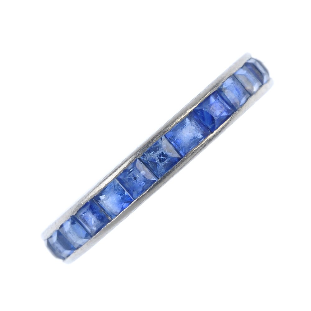SoldA sapphire and diamond full eternity ring. Designed asA sapphire and diamond full eternity ring. Designed as an alternating square-shape sapphire and single-cut diamond line. Estimated total diamond weight 0.20ct. AF. Ring size N. Weight 3.7gms.See Sold Price