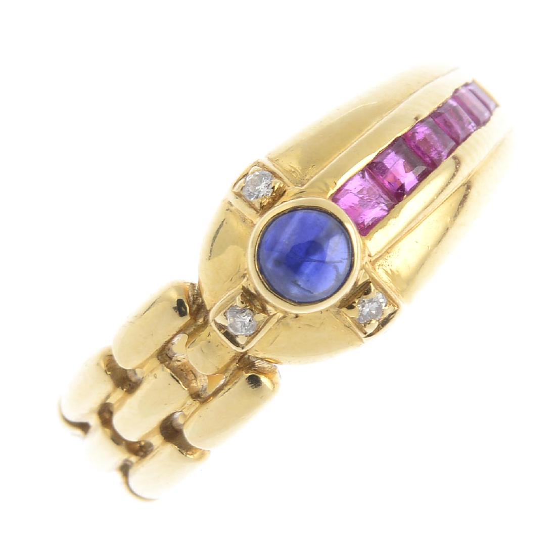 A sapphire, ruby and diamond dress ring. Designed as a