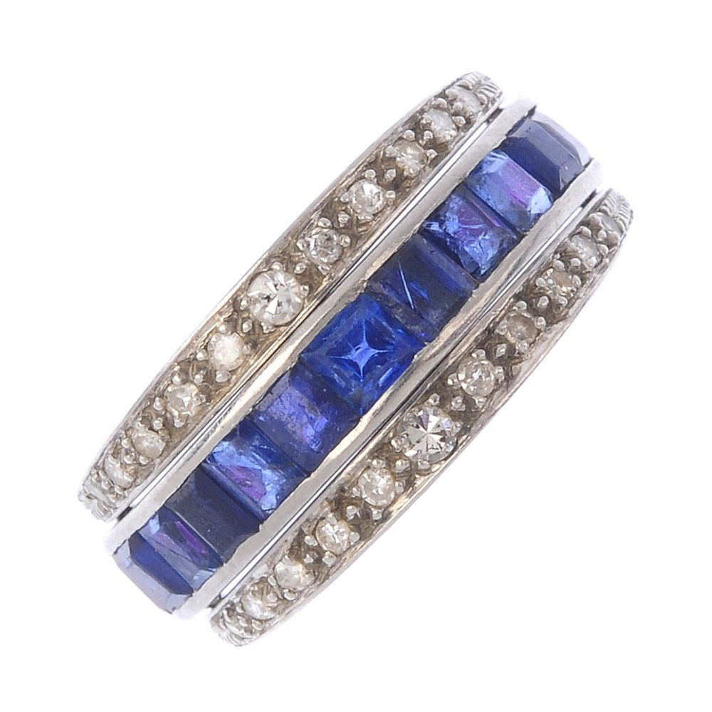 A sapphire, ruby and diamond flip ring. The calibre-cut