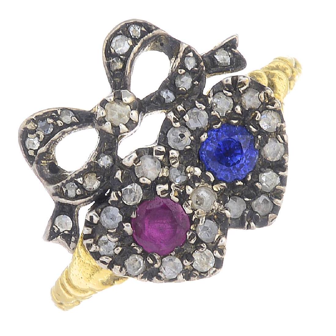 A sapphire, ruby and diamond ring. The circular-shape