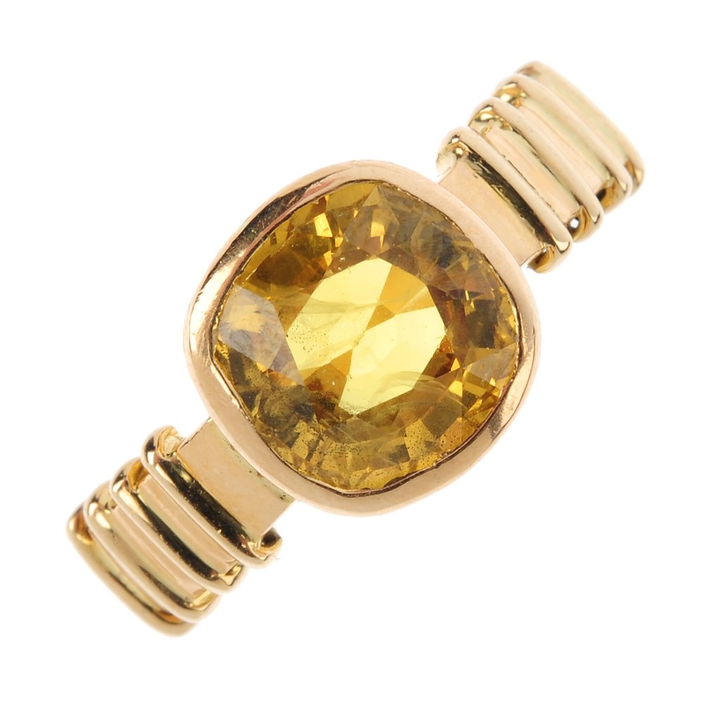 A sapphire single-stone ring. The cushion-shape yellow