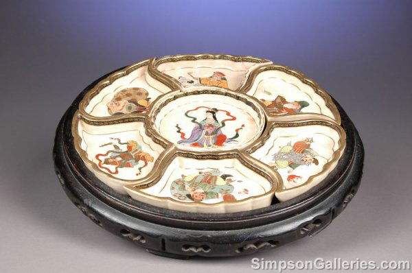 A SATSUMA SEVEN IMMORTALS DECORATED CONDIMENTS TR