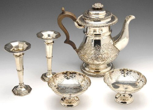ASSORTED SIGNED PEWTER TABLE ARTICLES, LOT OF SIX636 Lots AwaySilverplate and Sterling SilverMar 20, 2026A FOUR-PIECE SILVER 'BAMBOO' TEA AND COFFEE SERVICE, MARK OF ZEE WO, SHANGHAI, CIRCA 1870-19255 days Left2pc Birmingham Silver on Copper Teapot with Burner and EPNS Coffee PotMar 15, 2026Collection of Antique & Vintage Silver Plated Tea & Coffee Ware TeapotsCollection of Antique & Vintage Silver Plated Tea & Coffee Ware TeapotsAntique English Sterling Silver Tea & Coffee Set – Made for John Wanamaker, 2365gA collection of silver tea wares various makers and dates (5)Elegant 7 Piece Chippendale Silverplate Tea Set with Kettle and TrayMar 23, 2026Gorham Plymouth Sterling Silver Coffee & Tea SetMar 19, 2026Gorham Sterling Silver Tea and Coffee Service, 618 hrs LeftGroup of silver plate tea sets etc.Mar 19, 2026Fancy silver plate tea pots and moreMar 19, 2026American Sterling Silver Tea Service5 days LeftSix-piece Gorham 'Medallion' Silverplate Coffee and Tea Service and Six Coin Silver Tablespoons,3 pcs Antique Silver Plated Tea Pots, incl. Crescent, Meriden & Engstrom. Very Good Condition.
