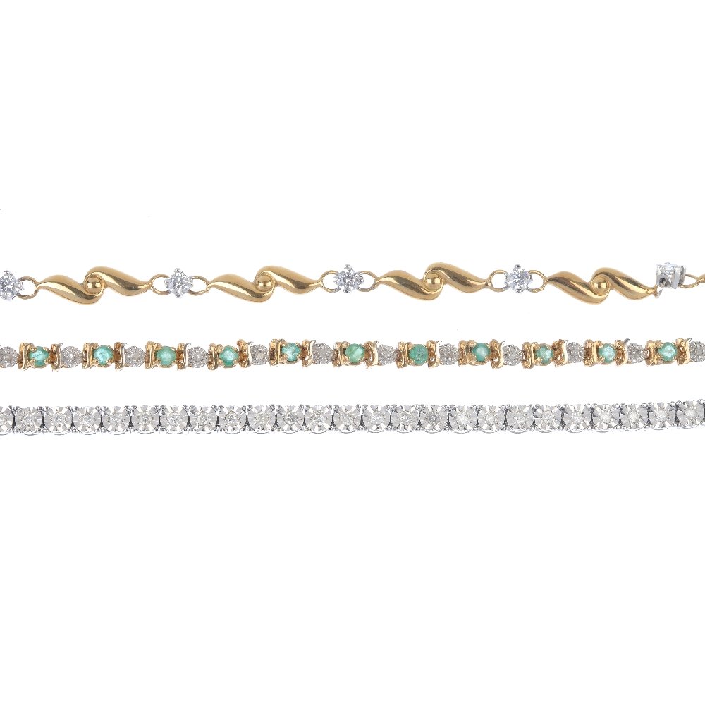 SoldThree gem-set bracelets. To include a 9ct gold amethystThree gem-set bracelets. To include a 9ct gold amethyst bracelet with cross spacers, a multi-gem and tapered bar bracelet, together with a 9ct gold blue topaz and colourless gem bracelet with scrollinSee Sold Price