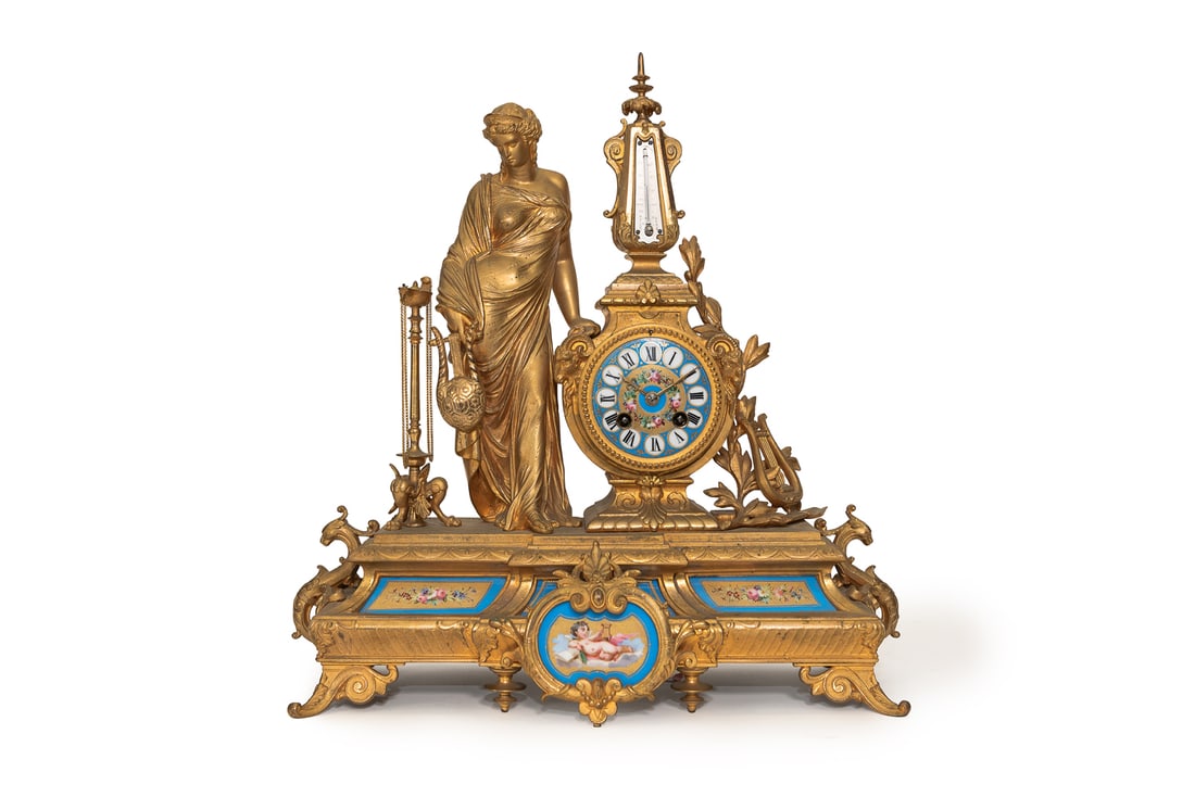 A Serves pattern gilt bronze and porcelain clock and thermometer