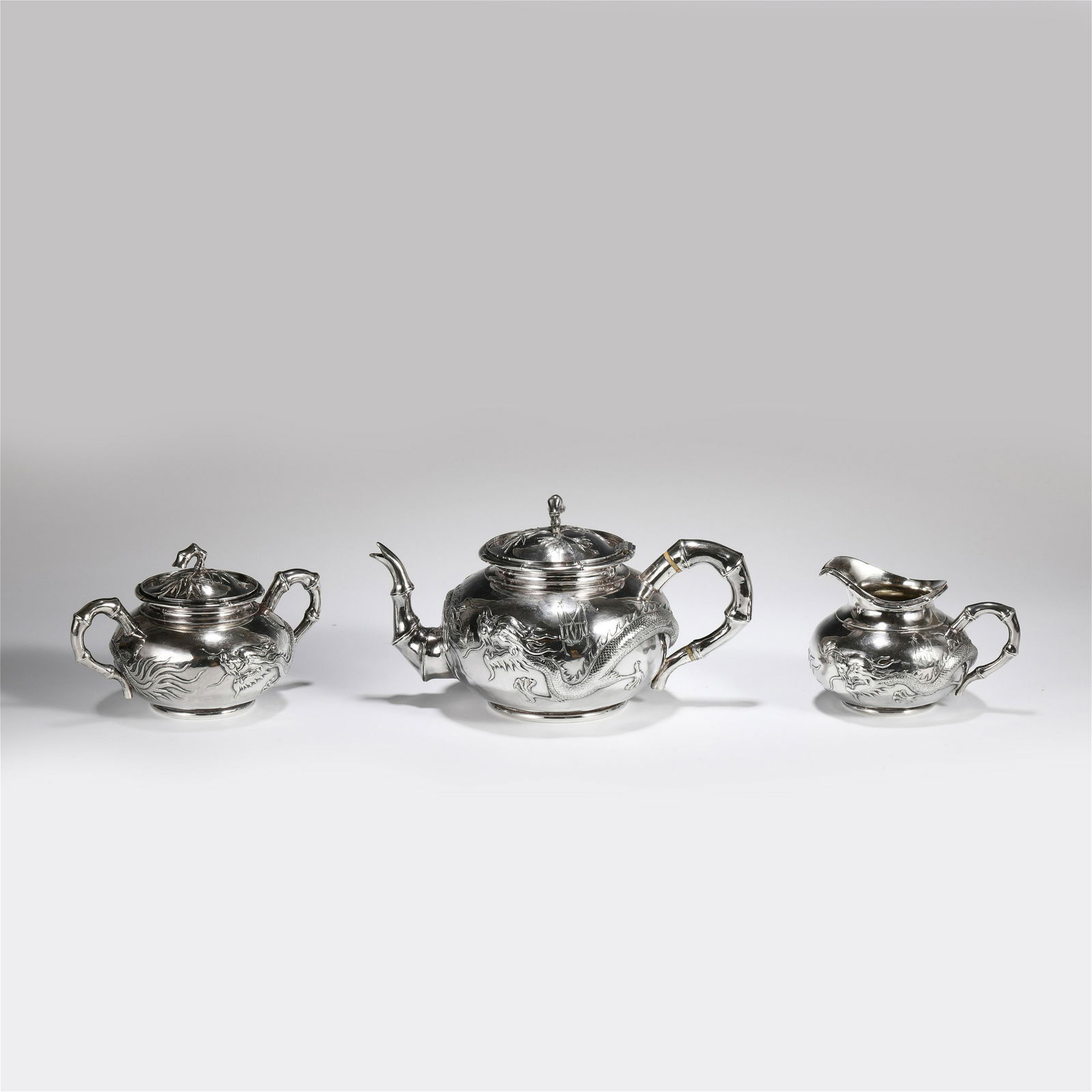 A SET OF CHINESE THREE EXPORT SILVERWARE TEA SETS