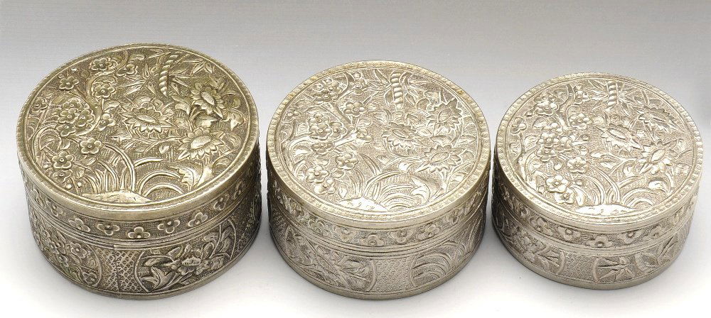 Chinese silversmith. Lidded jar richly decorated in relief with flowers and ornaments.Chairish Auctions4.5(10.3k)$120