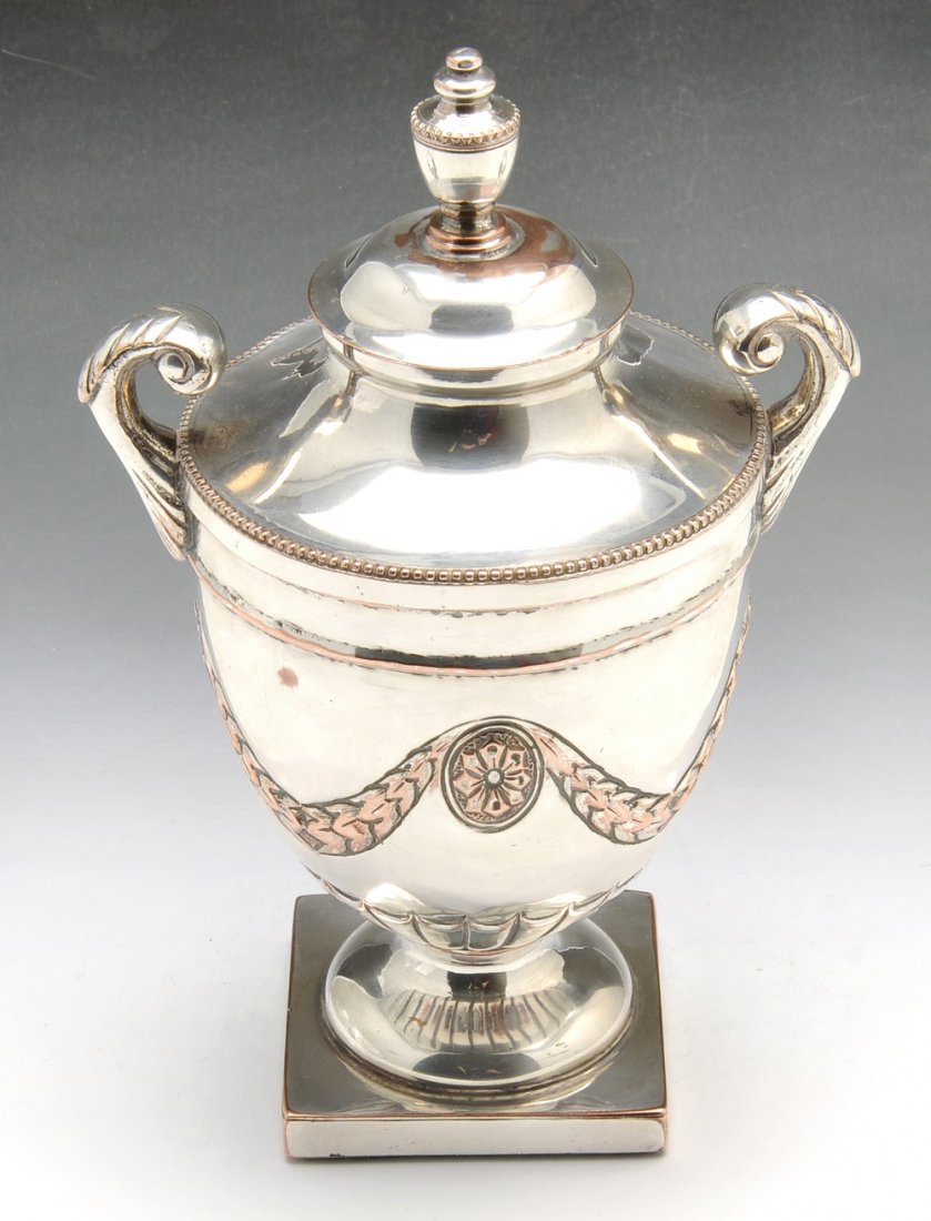 A Sheffield plate urn shape tea caddy.