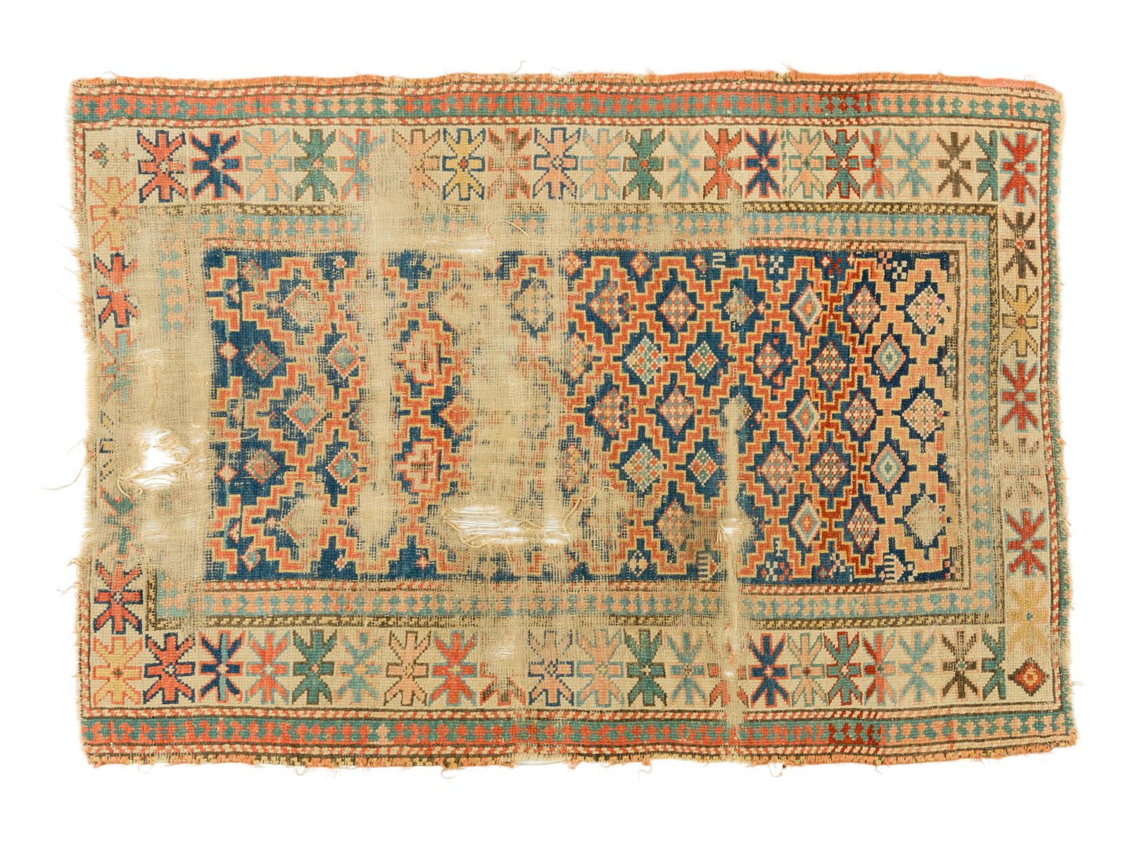 SoldAntique Azerbaijani Shirvan Wool RugDESCRIPTION: Antique Caucasian Shirvan woolen rug featuring a central field of geometric patterns against a cream ground framed by several borders of geometric shapes against red, blue, and green grouSee Sold Price