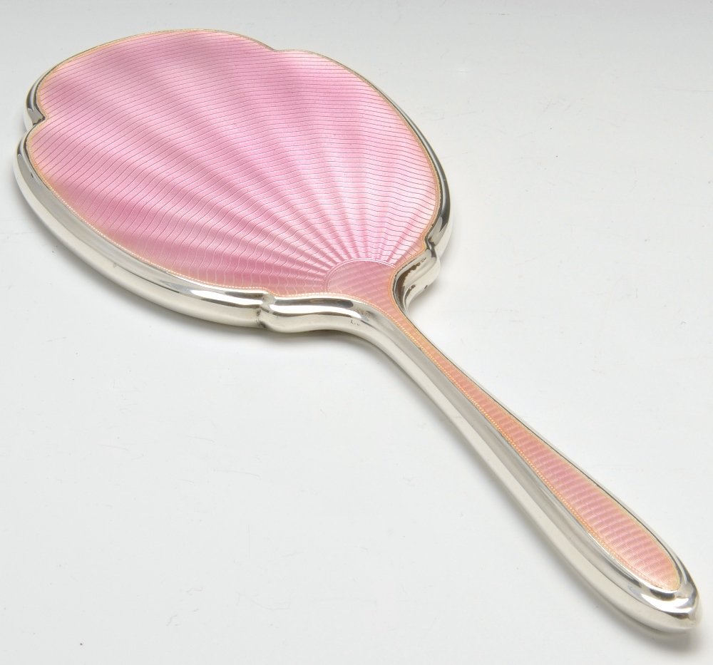 A silver and pink enamel hand mirror.
