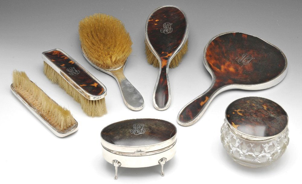 A silver and tortoishell dressing table set (7 pieces).