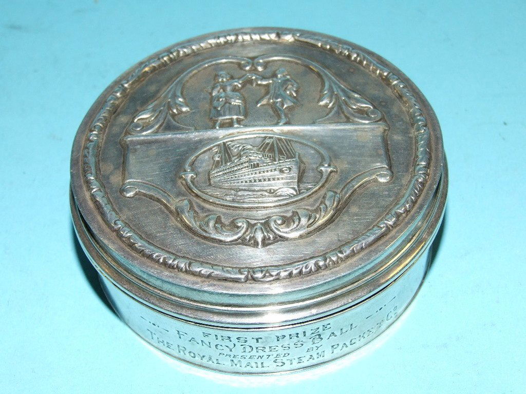 A silver box, decorated a ship and figures, inscribed
