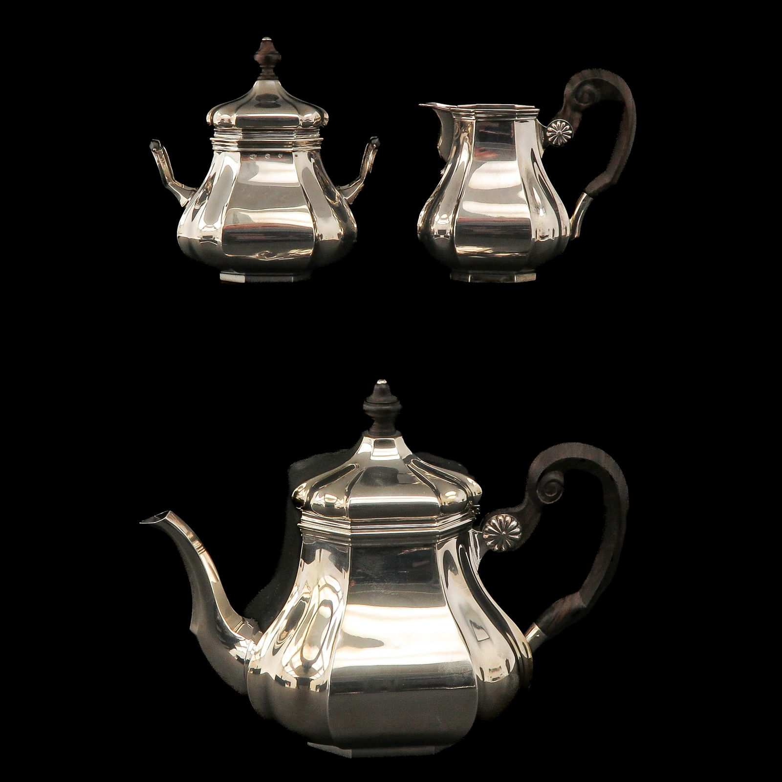 SoldTHREE PIECE MEXICAN SILVER COFFEE SETMelon form coffee pot, cream and covered sugar bowl. Rubbed marks. 2195 g tw. H of coffee pot 19.7 cm (7 3/4 in.)See Sold Price