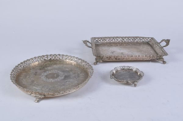 A silver coloured circular galleried salver, with