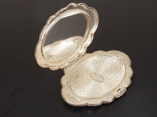 SoldAntique Fine French Silver Rocaille CompactRocaille, also called Roccoco (Italian) shell form compact. Partial engine turning design elements. Circa 1920. Has a set of three hallmarks on lip. Closses tight. Hinge good. Weighs 2 1/2 troy/silverSee Sold Price