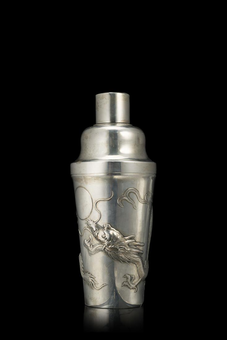 A silver-export cocktail shaker decorated with dragons