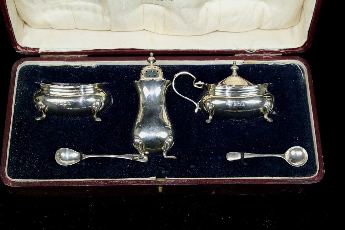 A silver five piece cruet, comprises pepperette,
