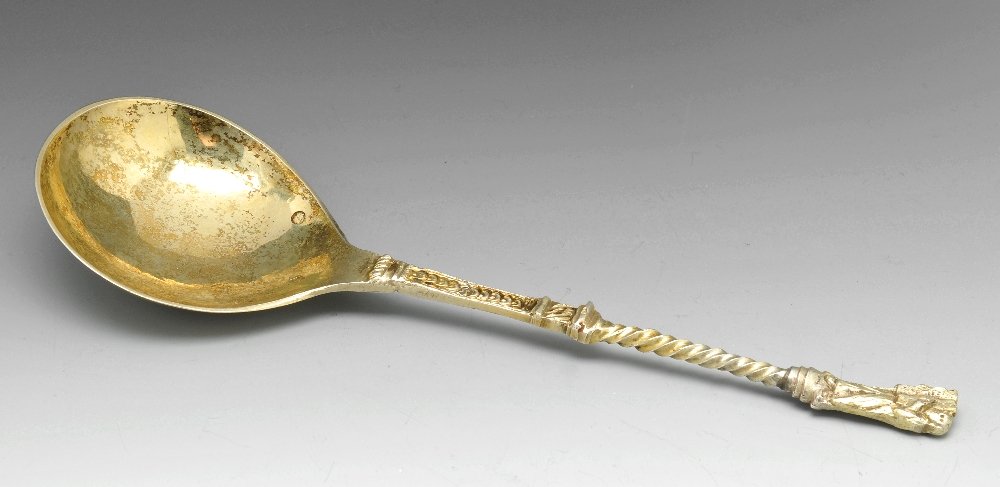 SoldFour early silver gilt spoons German or Austro Hungary, 17th century (4)Four early silver gilt spoons German or Austro Hungary, 17th century Variously engraved with dates 1637, 1633, and 1653 the terminals scrolling foliage and with shaped terminals, the longest 17.8cm,See Sold Price