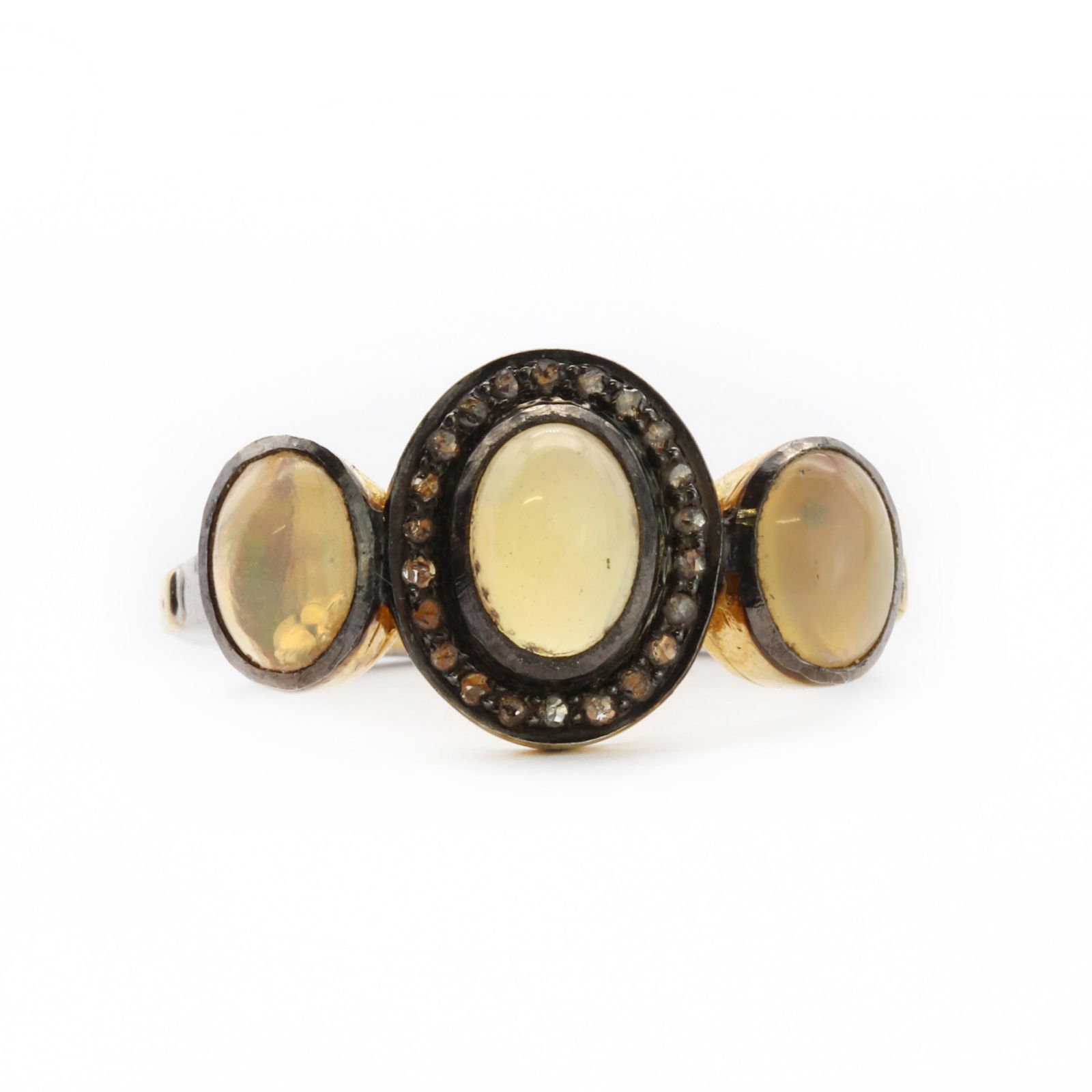 A silver gilt opal three stone ring,